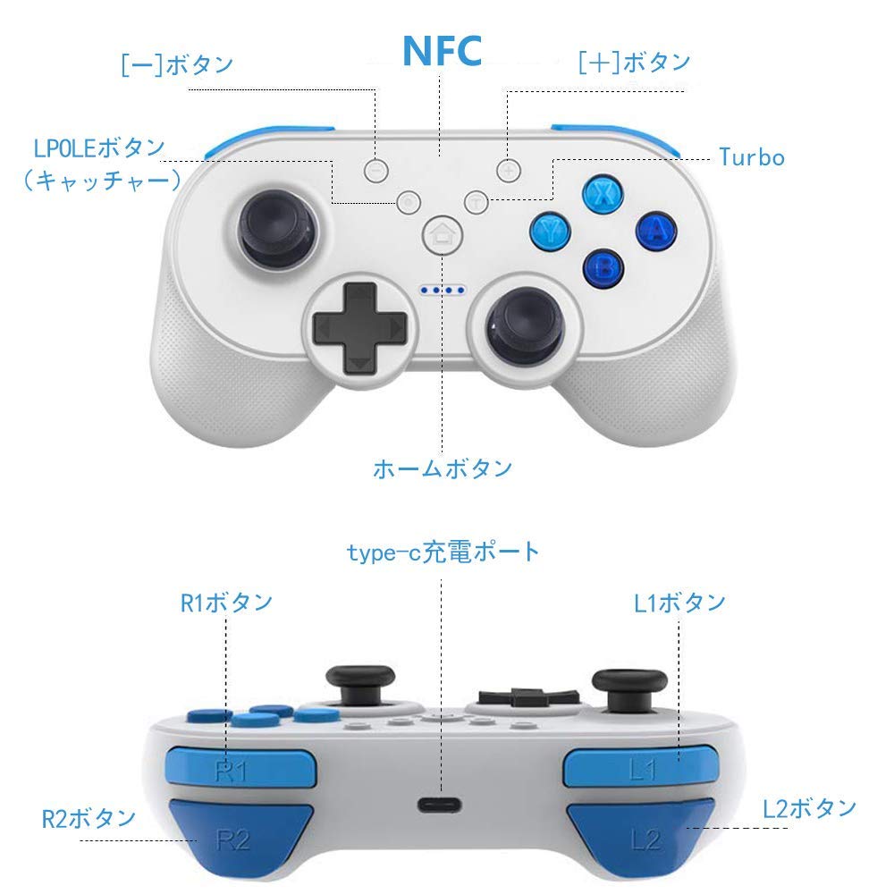 turbo連射&連打機能(調整可能)、ジャイロセンサー、NFC機能(amiibo対応)、振動機能、従来のコントローラー(プロコントローラー&joyconのHD振動以外)より繊細な振動で臨場感溢れるシーンを体感できます。