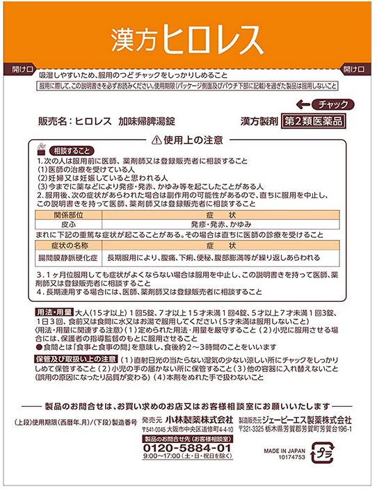◆漢方ヒロレス 加味帰脾湯錠はこのような方におすすめ 気が張って疲れやすい方におすすめ 気疲れ・イライラ・不安感… ◆漢方ヒロレス 加味帰脾湯錠の成分・分量 ニンジン:1.5g、ソウジュツ:1.5g、ブクリョウ:1.5g、サンソウニン:1.5g、リュウガンニク:1.5g、オウギ:1.5g、 トウキ:1.0g、オンジ:1.0g、サイコ:1.5g、サンシシ:1.0g、カンゾウ:0.5g、モッコウ:0.5g、タイソウ:1.0g、 ショウキョウ:0.5gより抽出(添加物:無水ケイ酸を含む) ◆漢方ヒロレス 加味帰脾湯錠の効能効果 体力中等度以下で、心身が疲れ、血色が悪く、ときに熱感を伴うものの次の諸症:貧血、不眠症、 精神不安、神経症 ◆漢方ヒロレス 加味帰脾湯錠の用法・用量 大人(15才以上)1回5錠、7才以上15才未満1回4錠、5才以上7才未満1回3錠、1日3回、 食前又は食間に水又はお湯で服用してください(5才未満は服用しないこと) ・食間とは「食事と食事の間」を意味し、食後約2〜3時間のことをいいます。